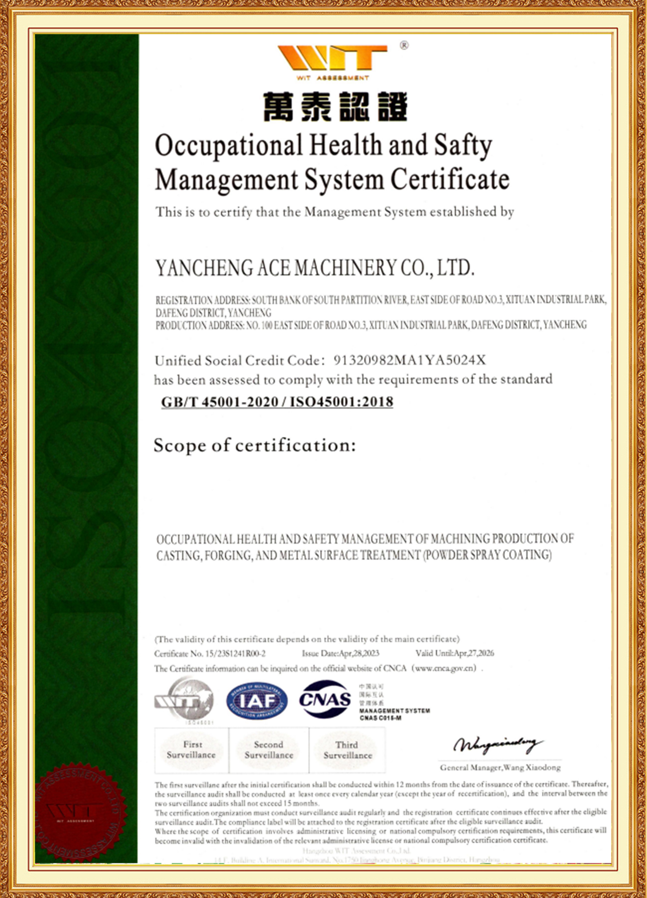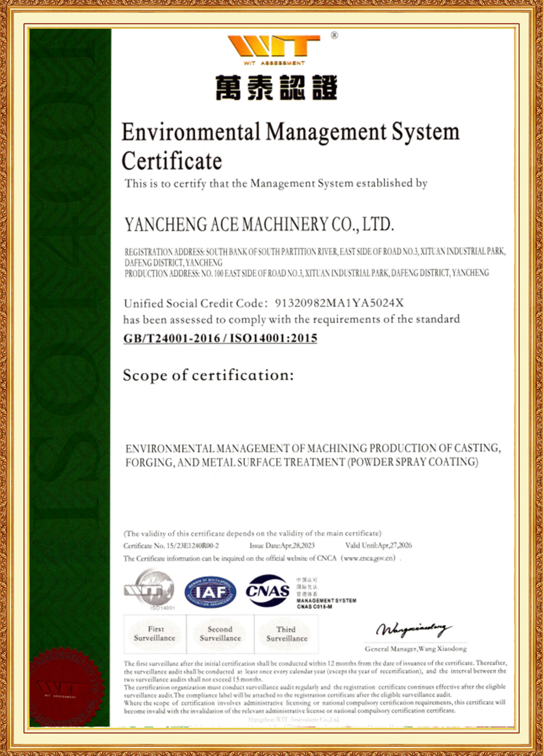 ACE Group je podporovaný manažérskym tímom mladých kľúčových členov, ktorí majú skúsenosti v oblasti materiálov, tepelného spracovania, obrábania a povrchových úprav. Sú dobre oboznámení s medzinárodnými a domácimi normami, sú priekopníkmi a zaviazali sa k inováciám. Dcérska spoločnosť ACE Machinery prešla certifikáciou systému manažérstva kvality ISO 9001 TÜV Rheinland, ako aj systémovými certifikáciami ISO 14001, 45001 a 50001. Je uznávaný ako špecializovaný, rafinovaný, jedinečný a inovatívny podnik, národný podnik v oblasti špičkových technológií a má podnikový úverový rating na úrovni 3A.